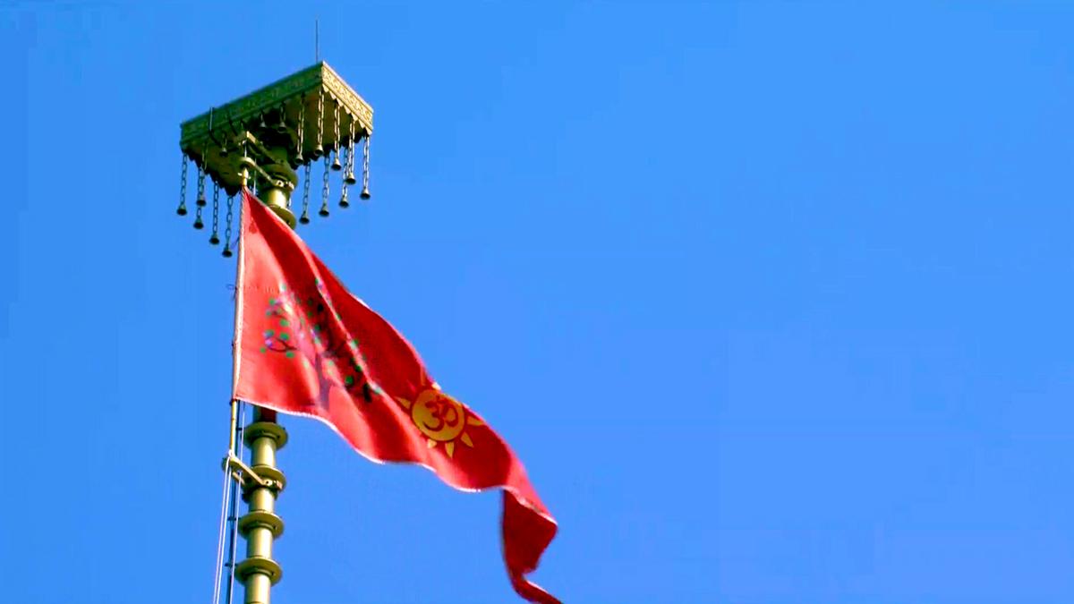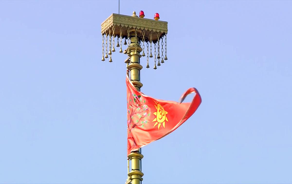 IMAGE: A view of the Dhwaj Stambh of the Shri Ram Janmabhoomi Mandir. Photograph: Video Grab/ANI Photo