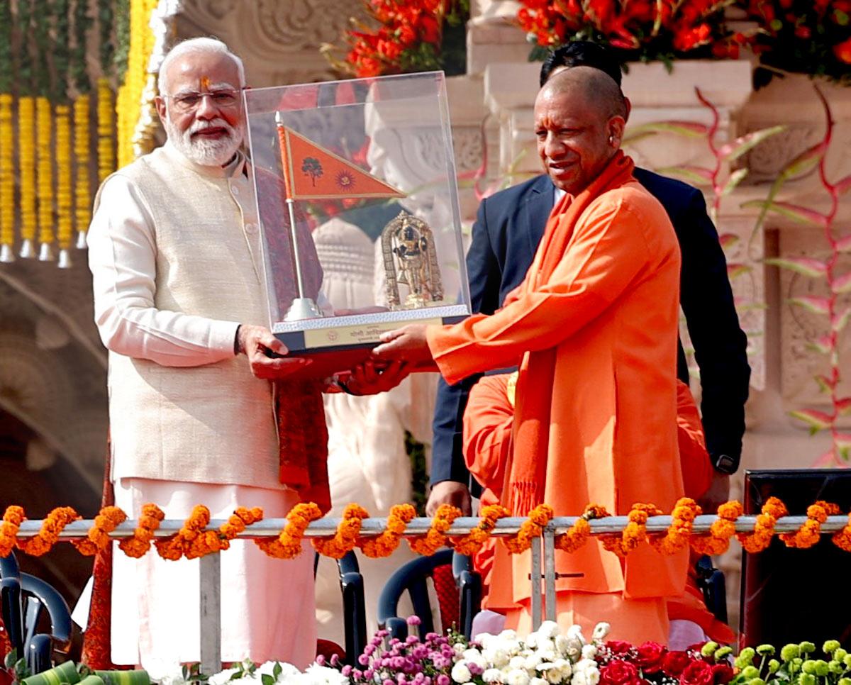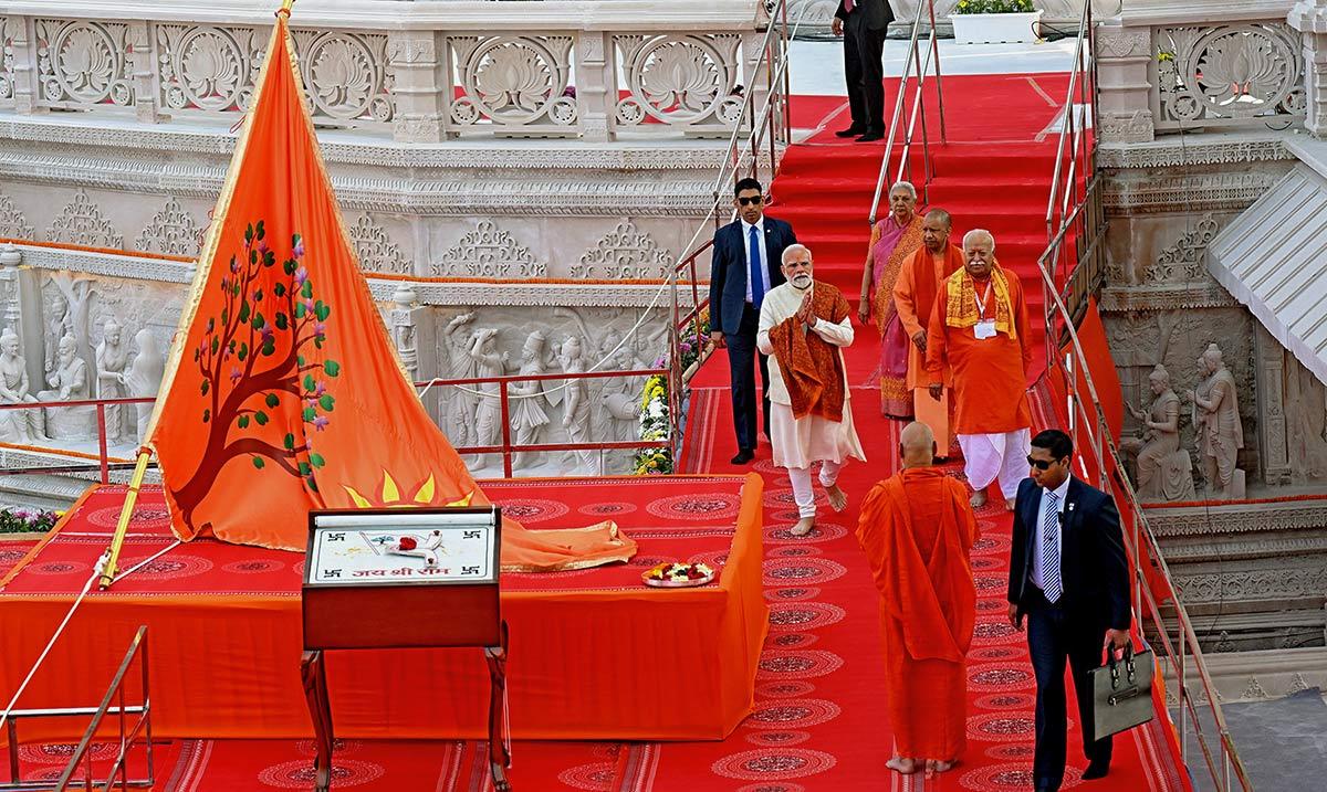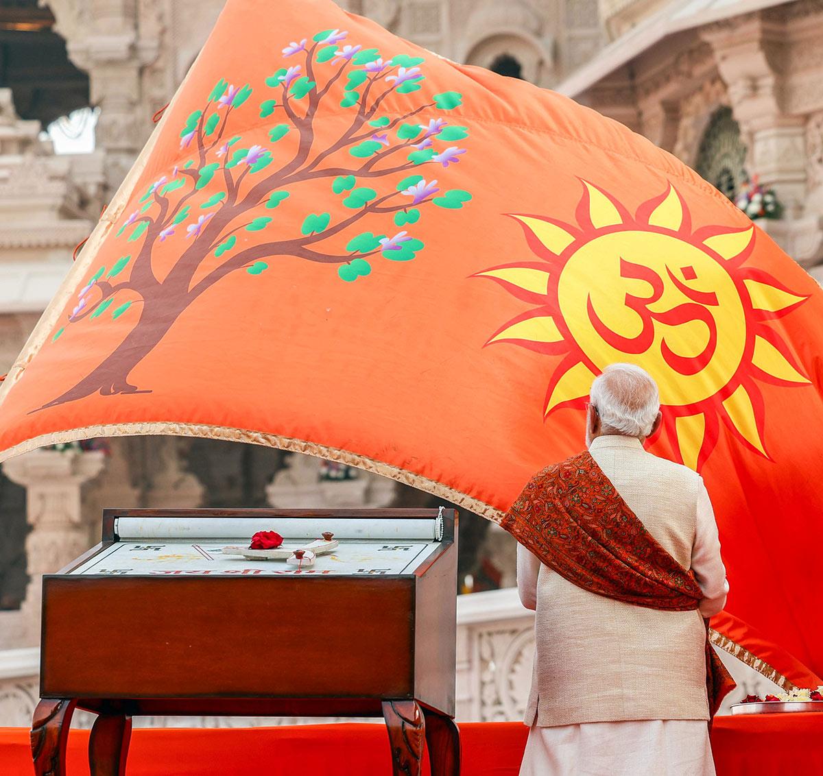IMAGE: Modi during the Dhwajarohan Utsav. Photograph: ANI Photo