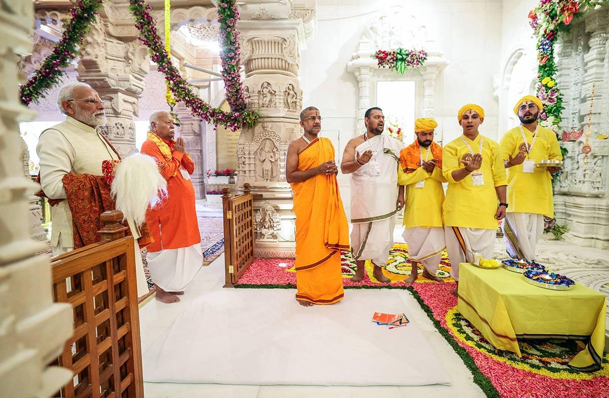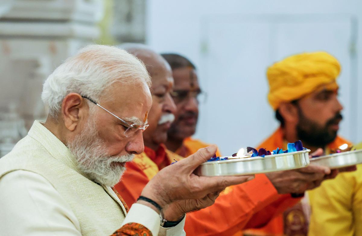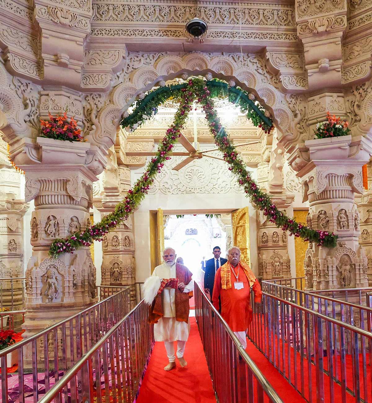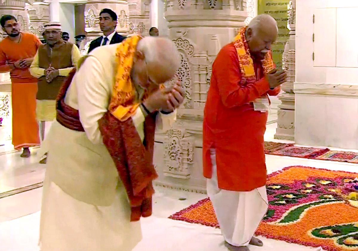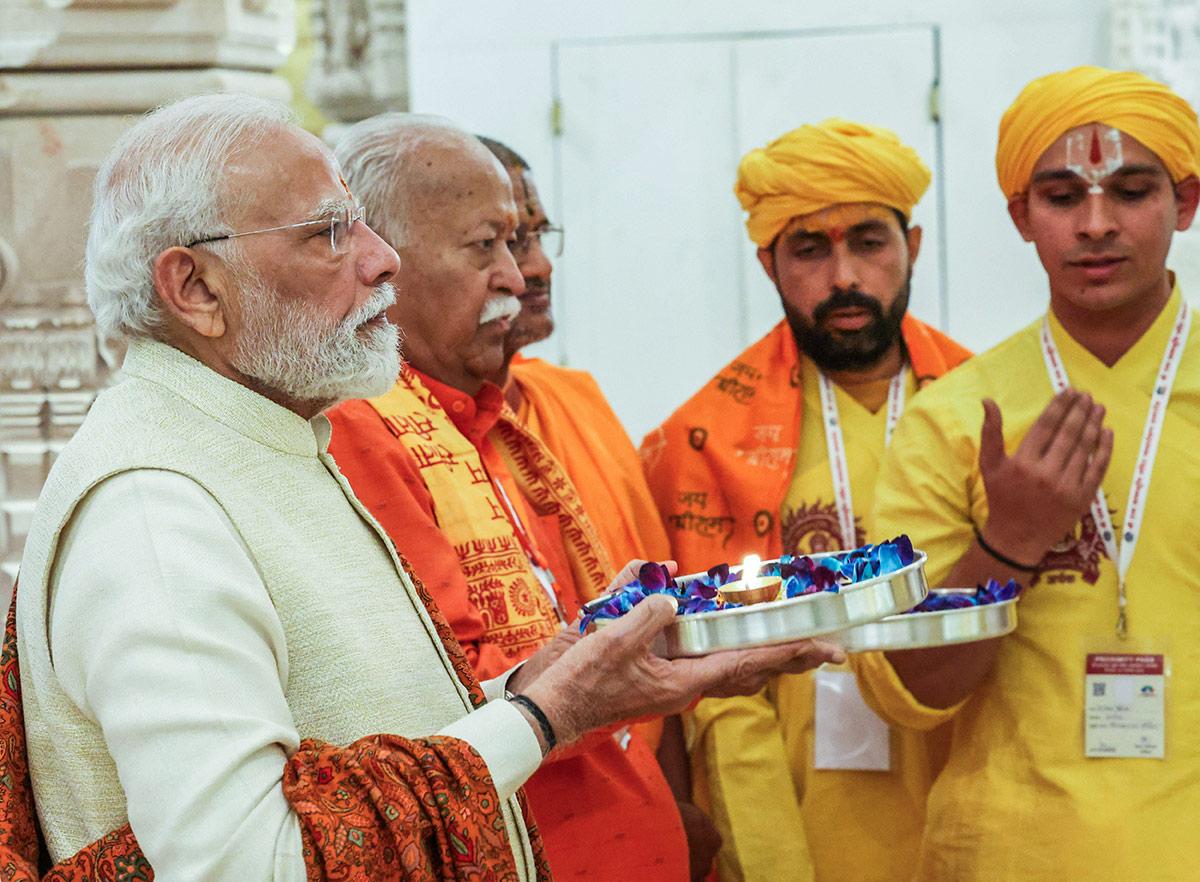 IMAGE: Prime Minister Narendra Modi and Rashtriya Swayamsevak Sangh Sarsanghchalak Mohan Bhagwat offer prayers at the Shri Ram Janmabhoomi Mandir on the occasion of Dhwajarohan Utsav, here and below. Photograph: DPR PMO/ANI Photo