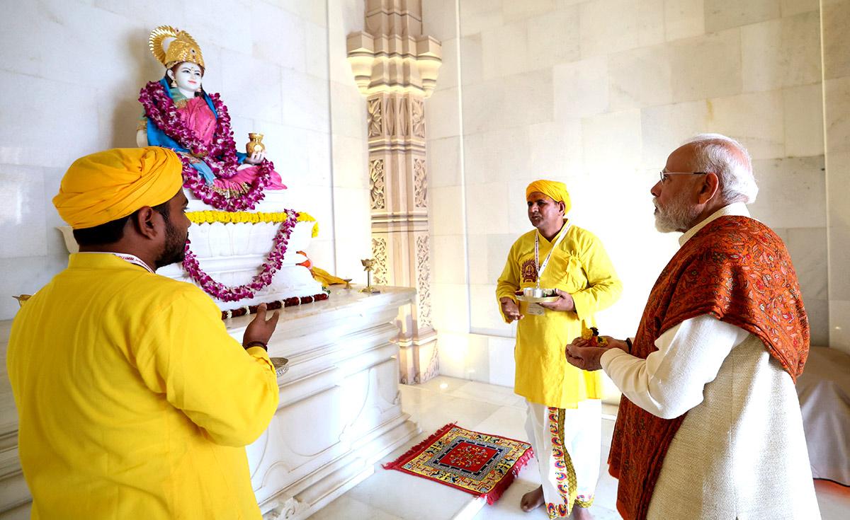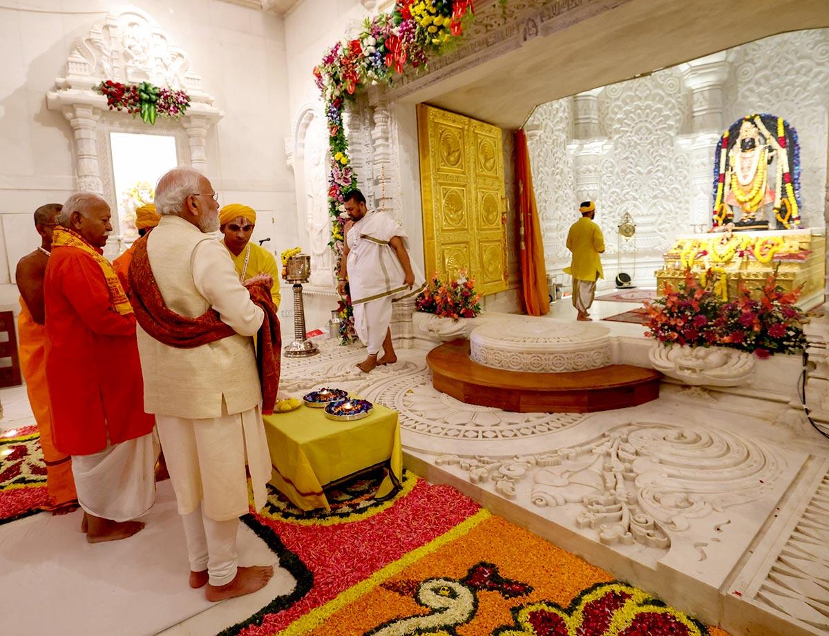 IMAGE: 'Today, before the Dharma Dhwajarohan Utsav at the Shri Ram Janmabhoomi Mandir in Ayodhya, I was blessed with the opportunity to pray and seek blessings at the Sapt Mandir complex within the temple premises,' Modi tweeted. Photograph: Kind courtesy @narendramodi/X