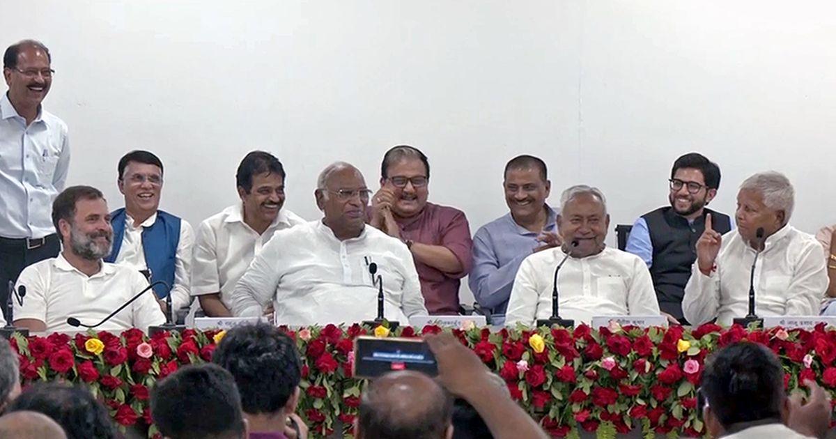 IMAGE: Bihar Chief Minister Nitish Kumar, Rashtriya Janata Dal chief Lalu Prasad Yadav, Congress President Mallikarjun Kharge, party leader Rahul Gandhi and others during a press briefing after the Opposition leaders' meeting, in Patna on June 23, 2023. Photograph: ANI Photo