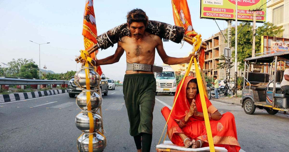 Kanwar is a portable frame, usually made from bamboo, to carry water from the Ganga River in the containers attached to it on either end.