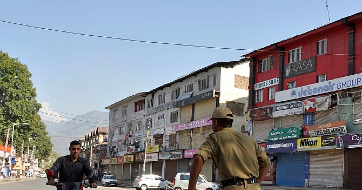 IMAGE: A policeman stops a biker at a blocked road during the 74th day of curfew and restrictions in Srinagar. Photograph: Umar Ganie
