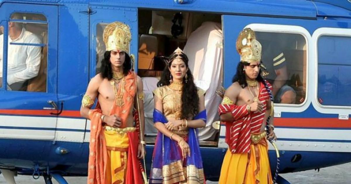 IMAGE: Actors dressed up as Rama, Sita and Lakshmana arrive by a helicopter decorated as the 'Pushpak Viman' during Deepotsav celebrations organised by the Uttar Pradesh government in Ayodhya in October. Photograph: Nand Kumar/PTI Photo