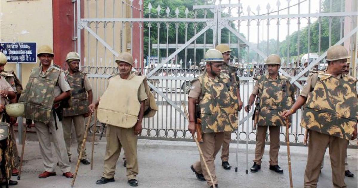 Image: Police men deployed at Banaras Hindu University in view of the students protests. Photograph: PTI Photo