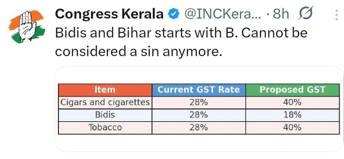 The Bharatiya Janata Party and Congress locked horns in Bihar on Friday over a social media post by the opposition party, which allegedly made disparaging remarks about the state while criticising the reduction in GST rates for "bidis".