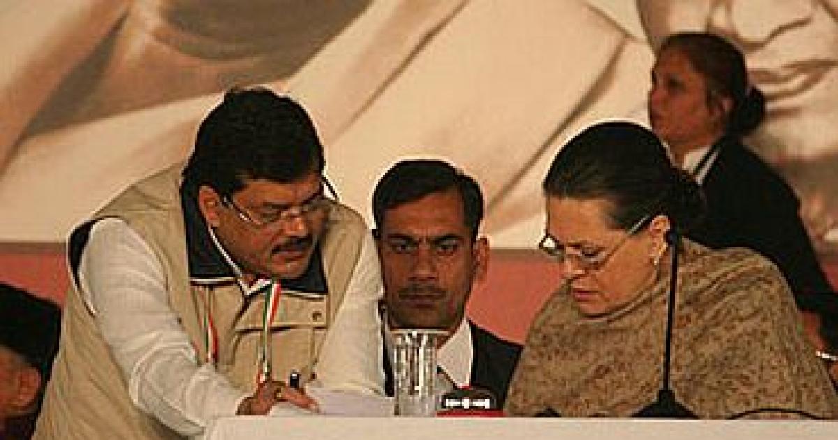 Image: Congress chief Sonia Gandhi (right) speaks with Mukul Wasnik (left) at the plenary meet on Monday