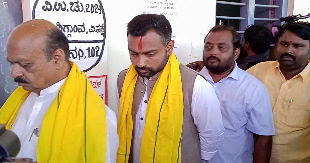 IMAGE: Karnataka ex-Chief Minister and BJP leader Basavaraj Bommai (left) stands in a queue to cast his vote for the Shiggaon assembly by-polls, in Shiggaon, Karnataka, November 13, 2024.Photograph: ANI Photo