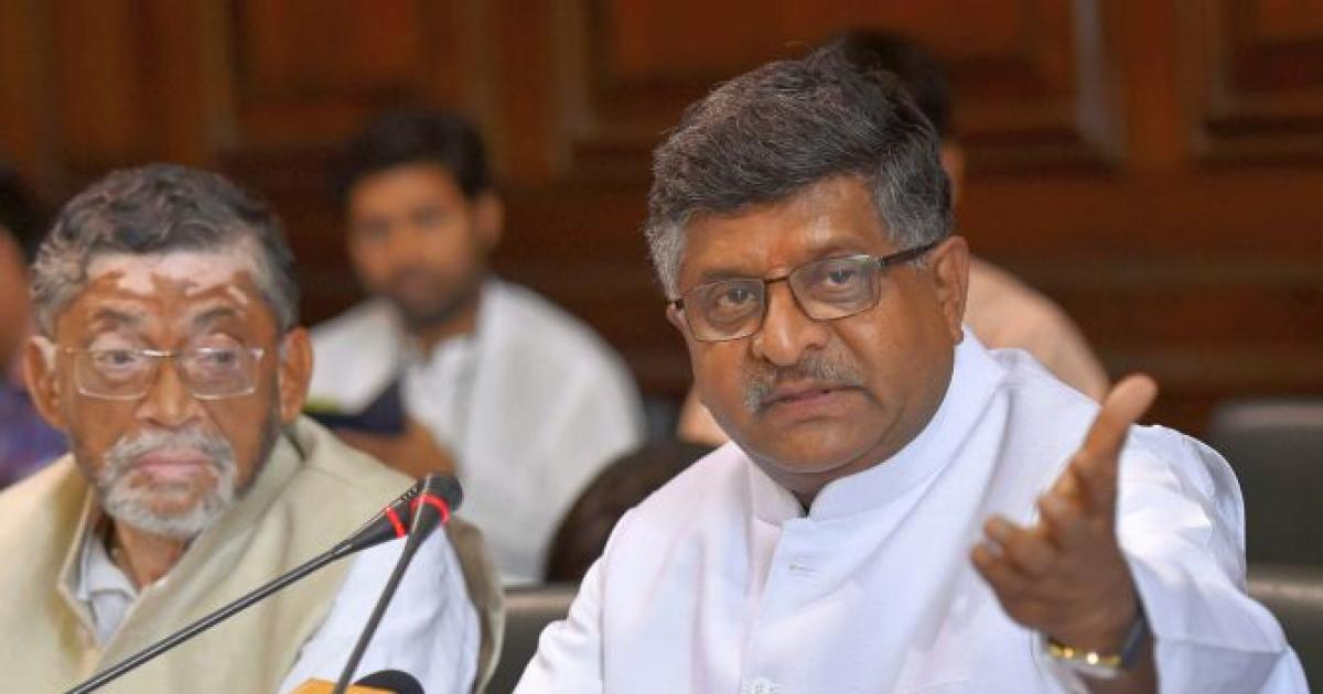 IMAGE: Law Minister Ravi Shanker Prasad with Labour minister Santosh Kumar Gangwar at a press conference at Parliament House in New Delhi. Photograph: Subhav Shukla/PTI Photo