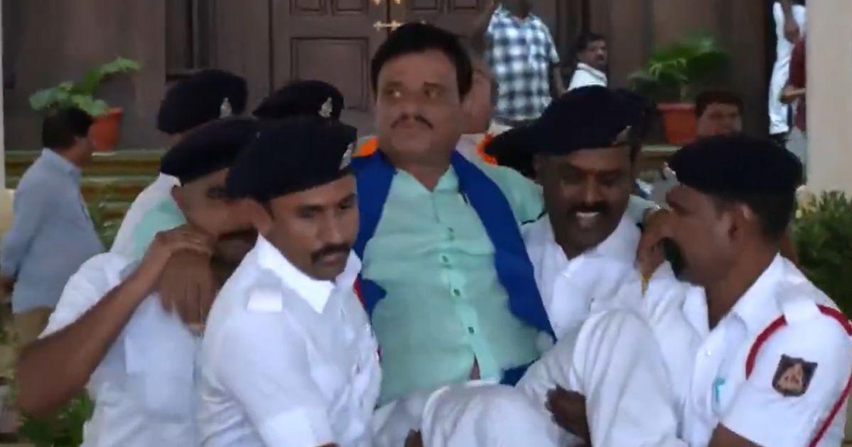 The incident took place on the final day of the assembly's budget session, when opposition BJP MLAs staged a protest against the 4 per cent reservation for Muslims in public contracts and called for a judicial inquiry into the alleged 'honey-trap' attempt against Cooperation Minister K N Rajanna.