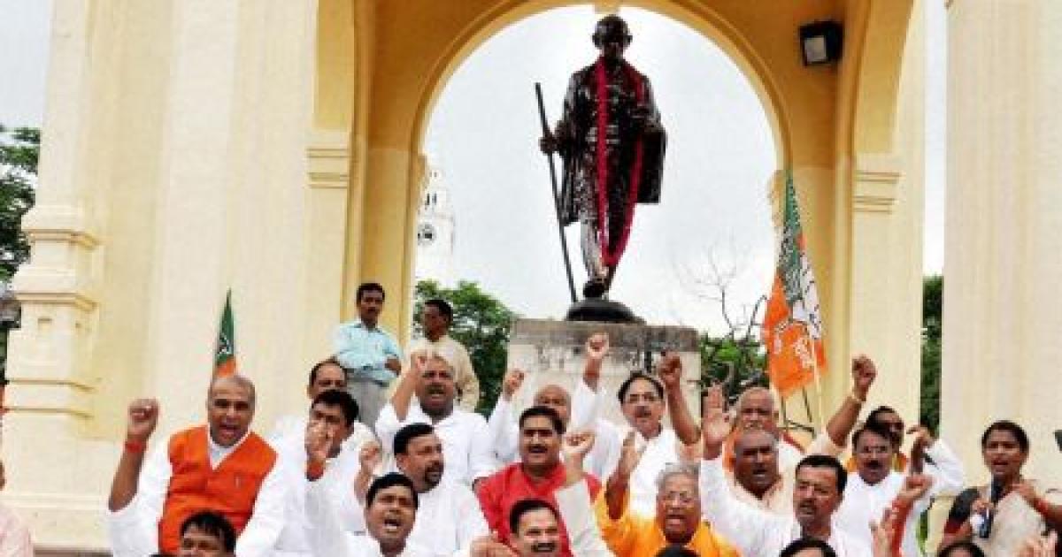 Image: : BJP MPs sitting on a dharna against Uttar Pradesh government over various issues including law & order, power and water crises at GPO in Lucknow on Monday. Photograph: PTI