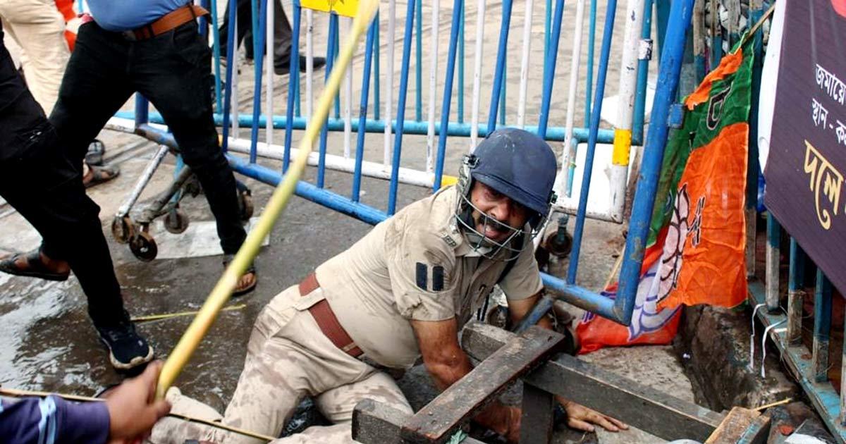 IMAGE: An assistant commissioner of police attacked by protesters in Kolkata during the Nabanna Abhijan protest. Photograph: ANI Photo