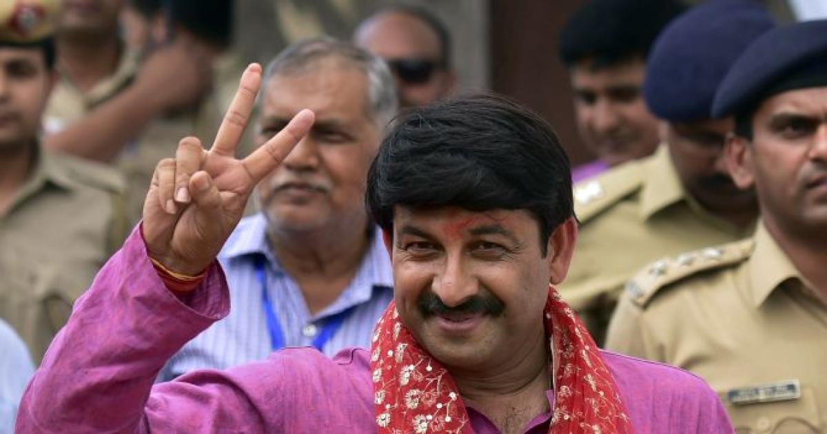 IMAGE: BJP candidate from North East Delhi Manoj Tiwari shows victory sign. Photograph: Arun Sharma/PTI Photo