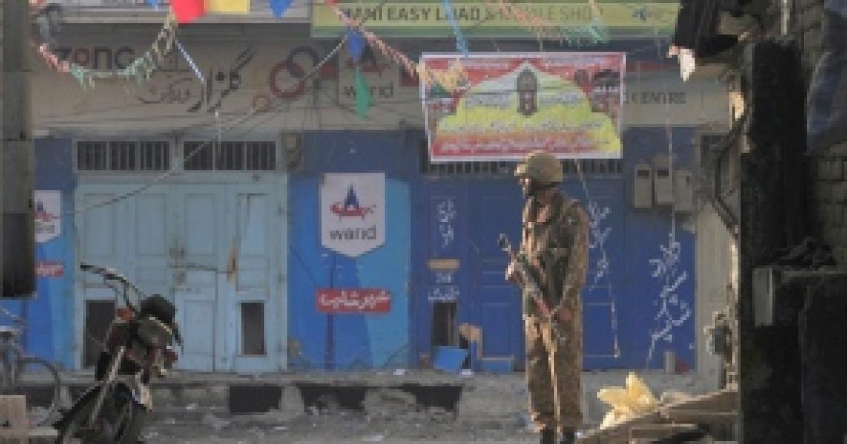 Image: A Pakistani soldier stands guard near the site of a suicide blast