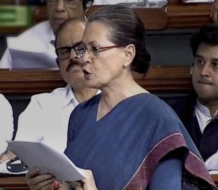 Image: Sonia Gandhi speaking out against the Modi government in Lok Sabha. Photograph: PTI/ Lok Sabha