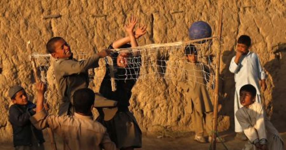 Image: Little Afghan boys play volleyball on the outskirts of Kabul. Photograph: Reuters