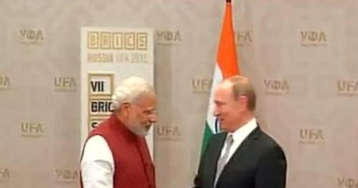 Image: PM Narendra Modi meets Russia's Vladimir Putin ahead of the BRICS summit. Photograph: ANI/Twitter