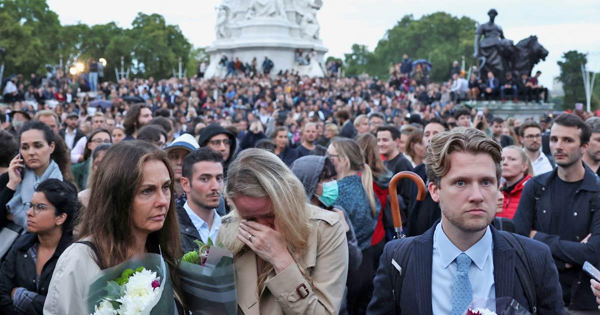 IMAGE: News about her majesty's death brought thousands of Britons outside Buckingham Palace, many in tears. Photograph: Henry Nicholls/Reuters