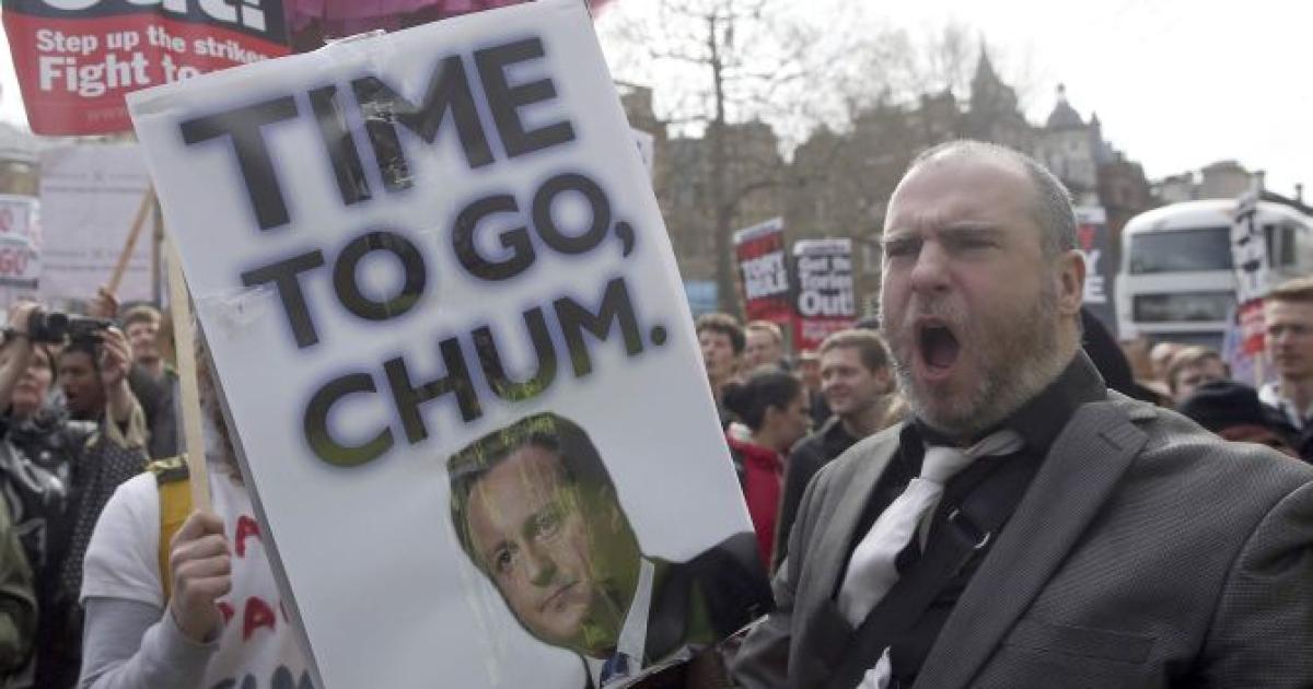 Image: Demonstrators hold placards during a protest outside Downing Street in Whitehall, central London. British Prime Minister David Cameron said on Saturday he should have handled scrutiny of his family’s tax arrangements better and promised to learn the lessons after days of negative media coverage and calls for his resignation Photograph: Neil Hall/Reuters