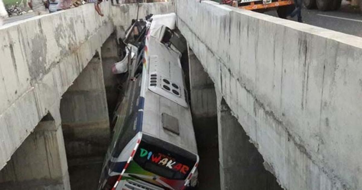 The private Volvo bus with 44 persons on board was on its way to Hyderabad from Bhubaneswar when the mishap occurred between two culverts on the highway, police said.