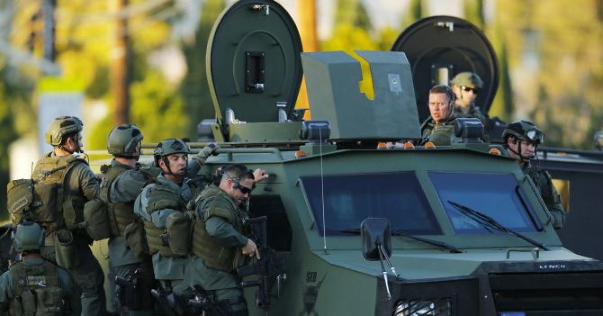 Gunmen opened fire on a holiday party on Wednesday at a social services agency in San Bernardino, California, killing 14 people and wounding 17 others, then fled the scene, triggering an intense manhunt and a shootoutout with police, authorities said. Photograph: Mike Blake/ Reuters