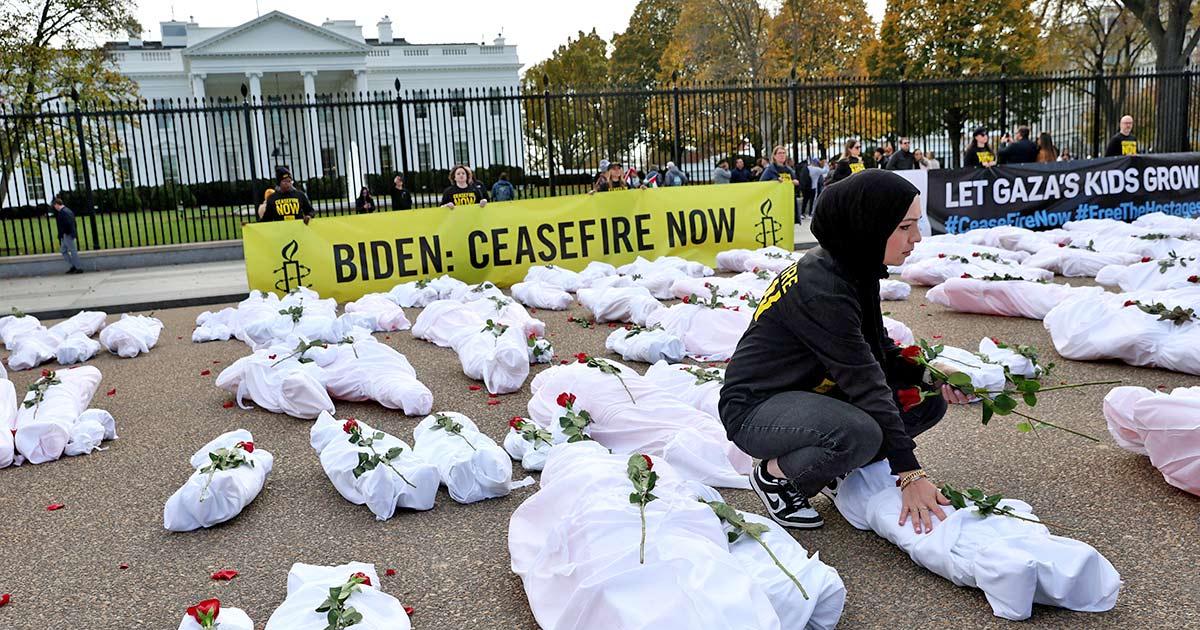 IMAGE: Isra Chaker of Amnesty International USA lays a rose on a prop representing a dead Palestinian child during a protest outside the White House in Washington, DC. Photograph: Leah Millis/Reuters