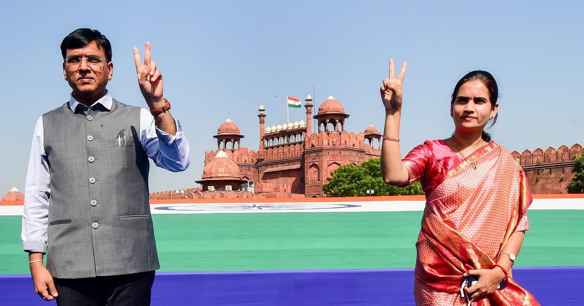 IMAGE: Union Health Minister Mansukh Mandaviya, left, and Union Minister of State for Health and Family Welfare Bharati Pravin Pawar at the launch of the celebrations for the 1 billion COVID-19 vaccination at the Red Fort in New Delhi. Photograph: Kamal Kishore/PTI Photo