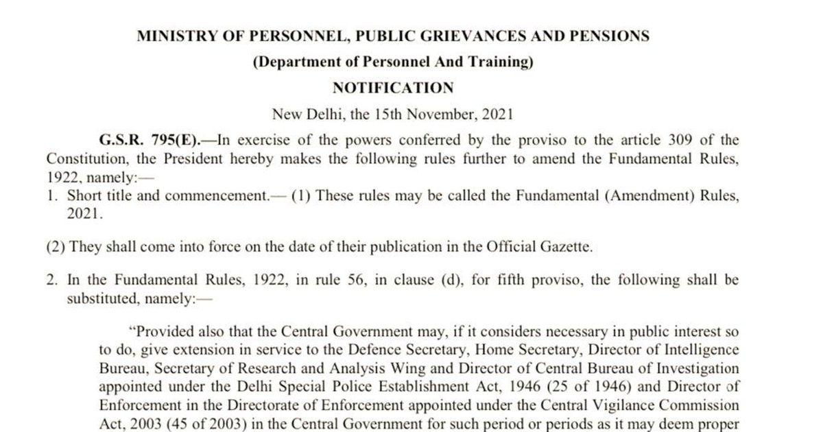 The rules now allow the central government to give extension in the public interest to the defence secretary, home secretary, director of Intelligence Bureau, secretary of Research and Analysis Wing and directors of Central Bureau of Investigation and Enforcement Directorateon a case-to-case basis, subject to the condition that the total term of such secretaries or directors, "does not exceed two years or the period provided in the respective Act or rules made thereunder", according to a personnel ministry notification.