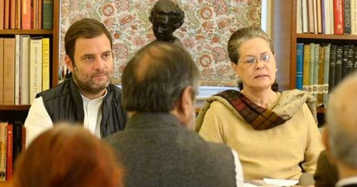 IMAGE: Congress president Sonia Gandhi and vice president Rahul Gandhi with other leaders at the Congress Working Committee meeting in New Delhi on Monday. Photograph: Courtesy @INCIndia/Twitter