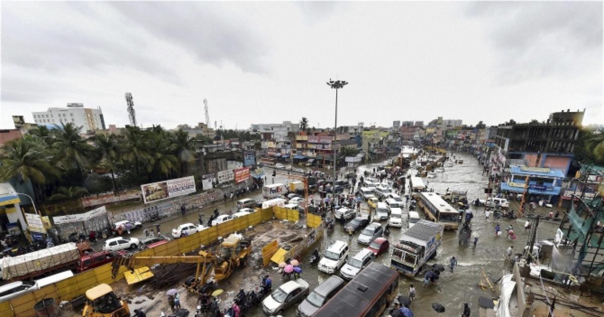 Vehicles move on a water lodged road during heavy rains in Chennai. Photograph: PTI