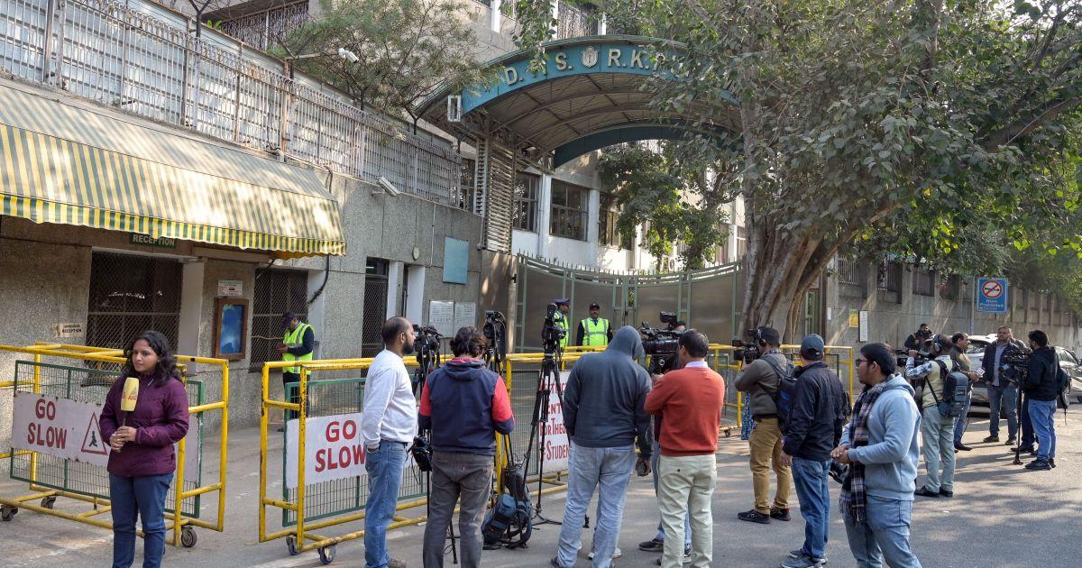 IMAGE: Mediapersons seen outside DPS School RK Puram after it received bomb threat call via email, in New Delhi. Photograph: ANI Photo