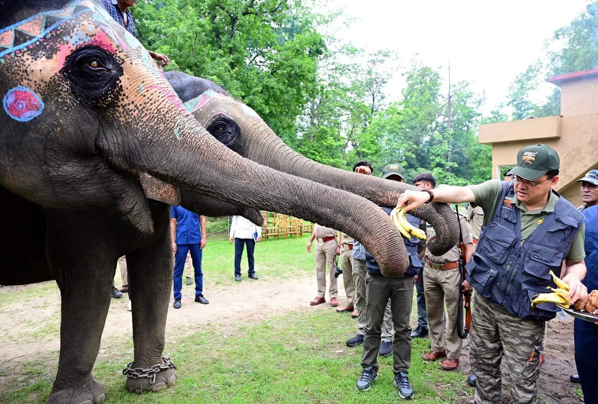 IMAGE: Pushkar Singh Dhami feeds elephants during his jungle safari. All photographs: @pushkardhami X/ANI Photo