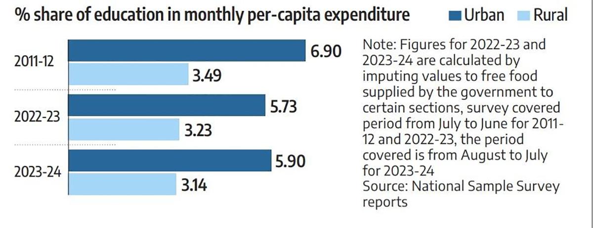 Urban households spent close to six per cent of their monthly per-capita expenditure on education in 2023-2024, against a bit over three per cent in rural areas.