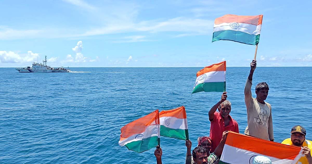 IMAGE: Coast Guard ships patrolling the Bay of Bengal distributed National Flags to fishermen operating around Paradip as part of the Har Ghar Tiranga initiative, in Jagatsinghpur, Odisha, July 31, 2022. All photographs: Indian Coast Guard Twitter/ANI Photo