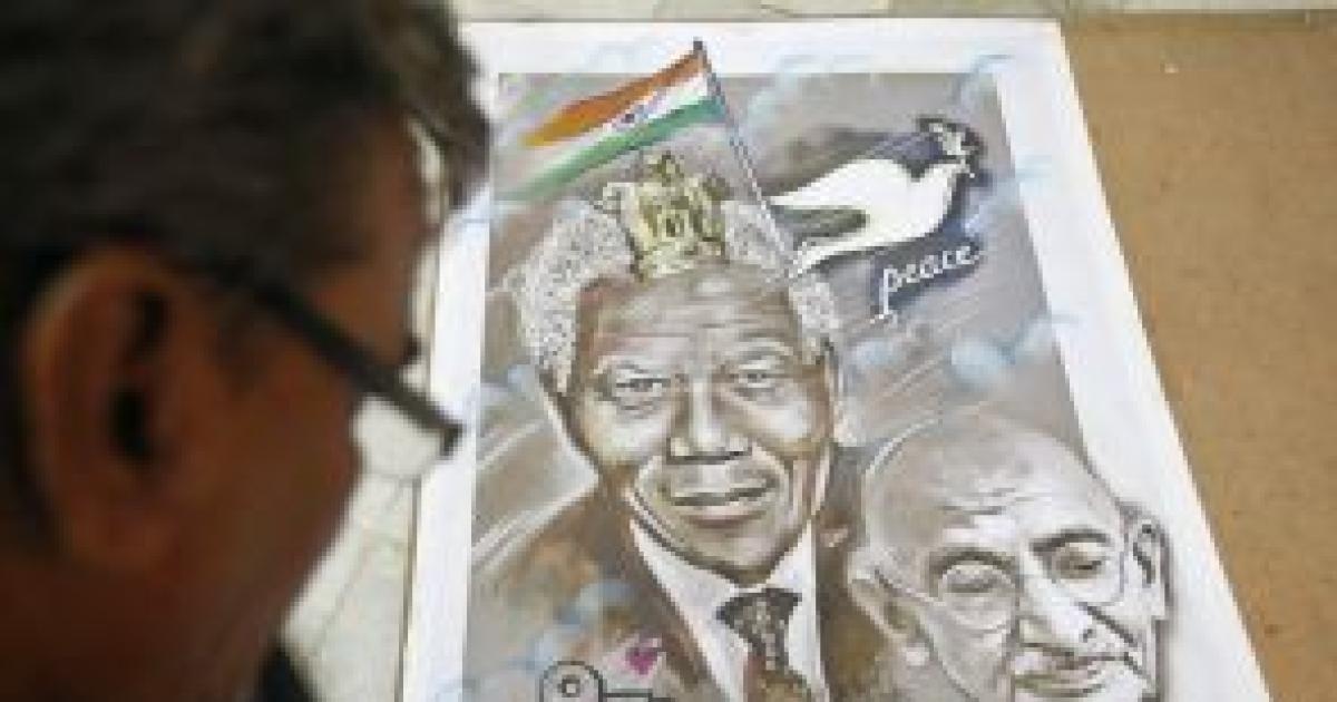 Image: Artist Aejaz Saiyed works on a poster featuring Nelson Mandela and Mahatma Gandhi on Mandela's 95th birthday in Ahmedabad. Photograph: Amit Dave/Reuters