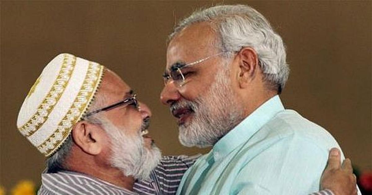 Image: A Muslim leader hugs Modi during his fast in Ahmedabad last year