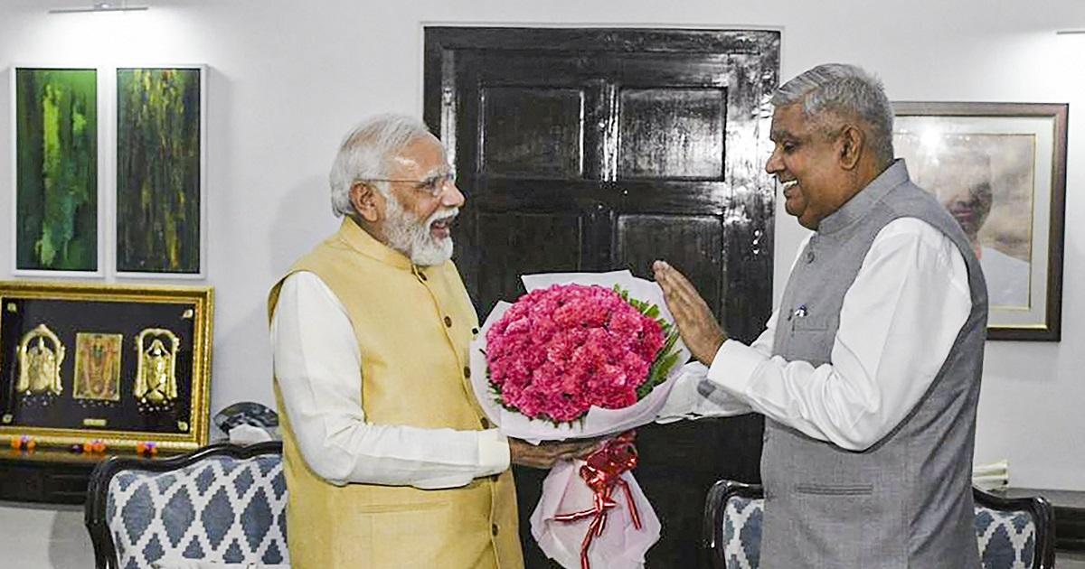 Modi met the vice president-elect at the residence of Parliamentary Affairs Minister Pralhad Joshi and greeted him with a bouquet. The prime minister later thanked all those MPs who voted for Dhankhar.