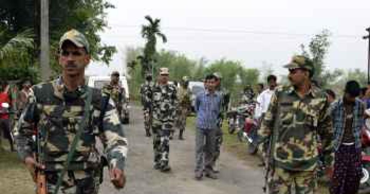 Image:Security personnel patrol the attack-hit area of the Balapara villagein Assam