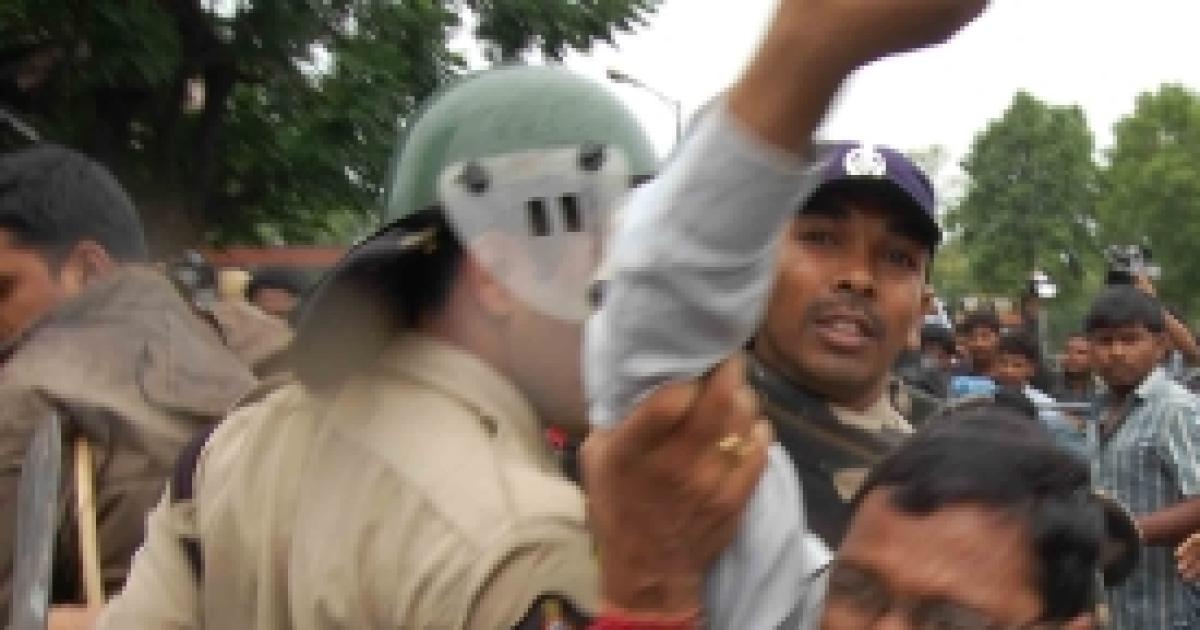 Image: Police grapple with a Telangana activist in Hyderabad