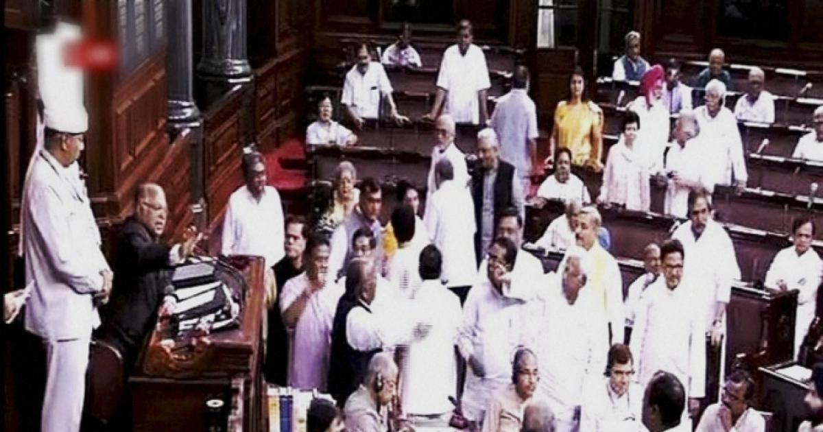 IMAGE: Congress MPs protest in the well of the Rajya Sabha in New Delhi. Photograph: PTI/TV grab