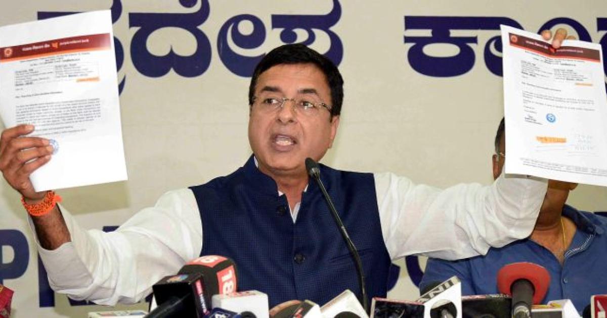 IMAGE: Congress spokesperson Randeep Singh Surjewala addresses a press conference in Bengaluru on Tuesday. Photograph: PTI Photo