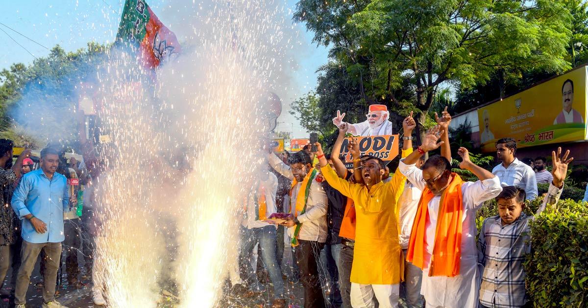 As the BJP won for a third consecutive term, party workers and leaders were in a jubilant lot, distributing 'ladoos' and sweets with many dancing to the beats of 'dhols'.