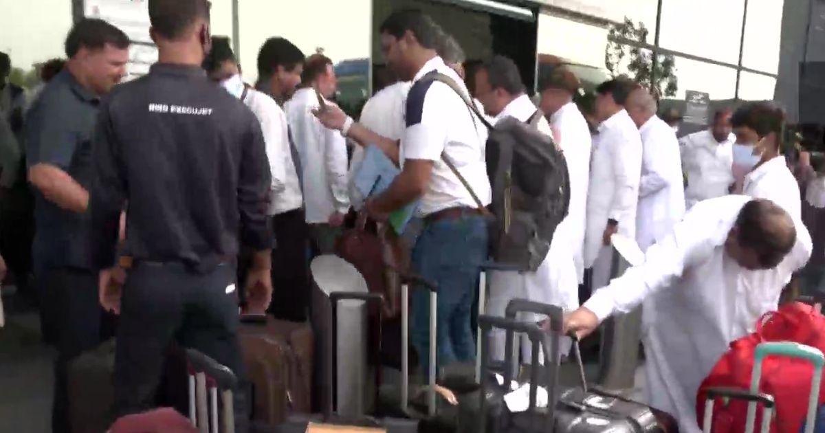 IMAGE: Congress MLAs from Haryana at Delhi airport on the way to Chhattisgarh. Photograph: ANI on Twitter