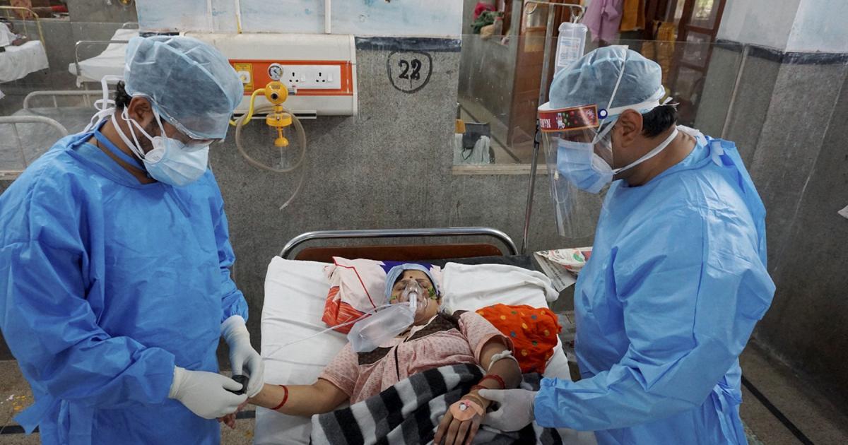 IMAGE: Doctors attend a patient in the COVID-19 ward of the Hallet Hospital, in Kanpur. Photograph: PTI Photo