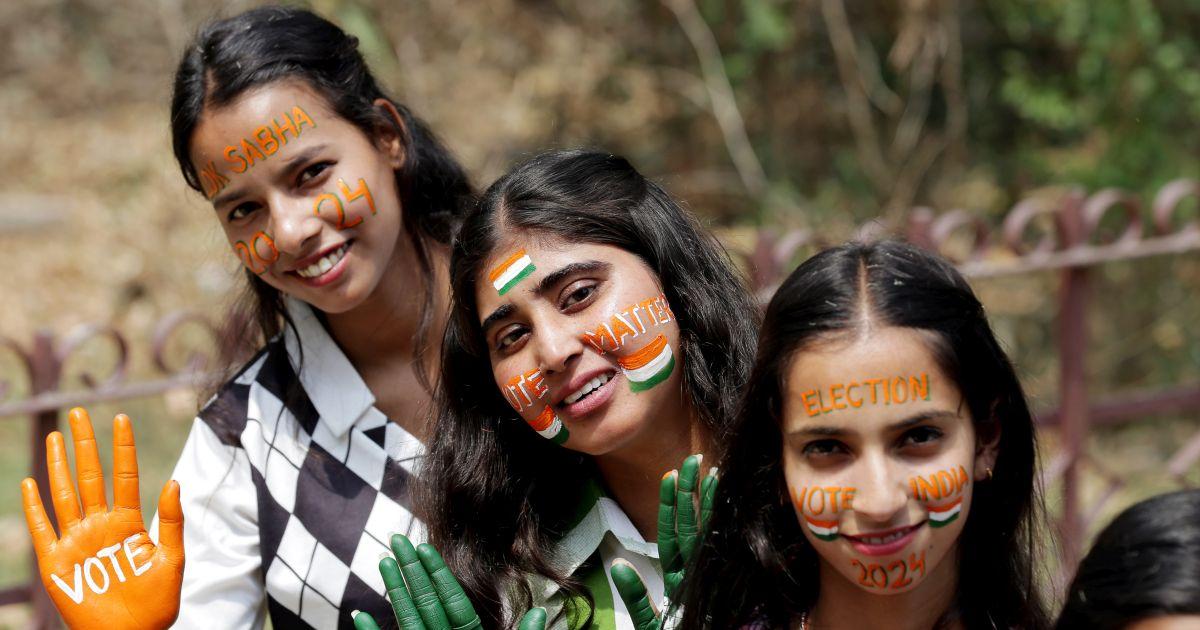 Girls with their faces and hands painted with words to encourage citizens to vote in Amritsar, April 14, 2024. Photograph: Raminder Pal Singh/ANI Photo