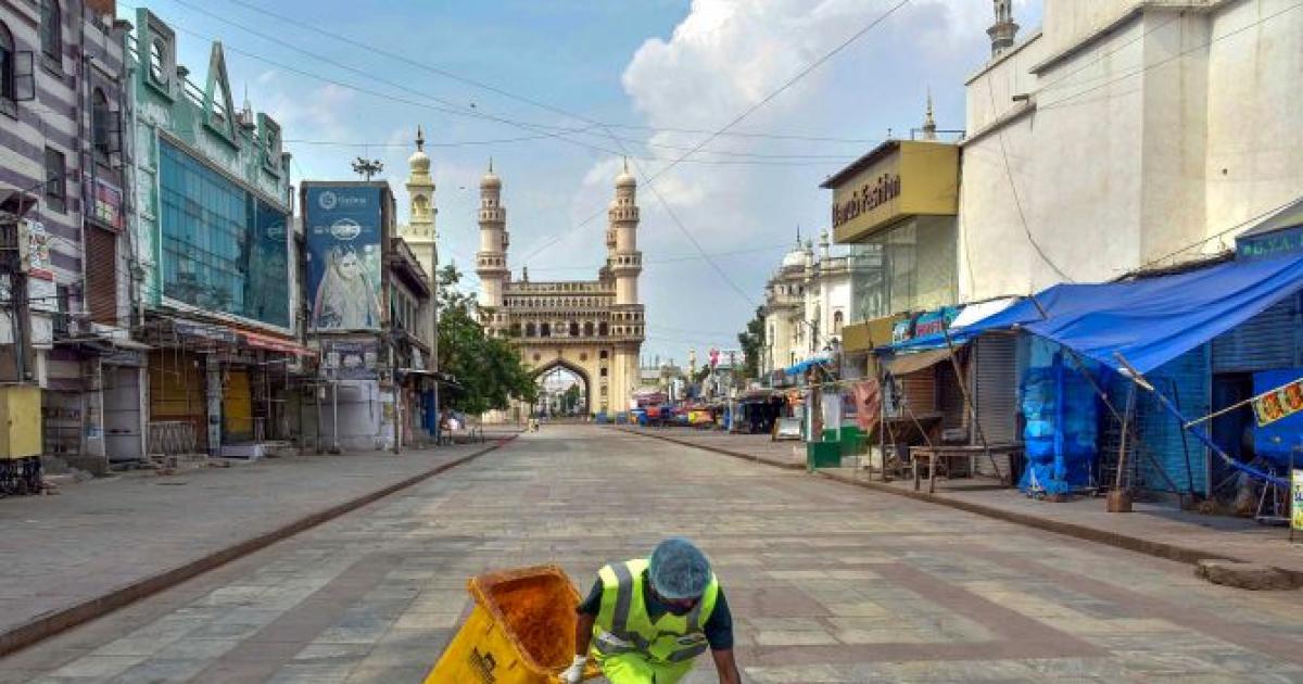 IMAGE: A GHMC worker cleans an area in the old city of Hyderabad during the nationwide lockdown imposed in wake of the coronavirus pandemic. Photograph: PTI Photo