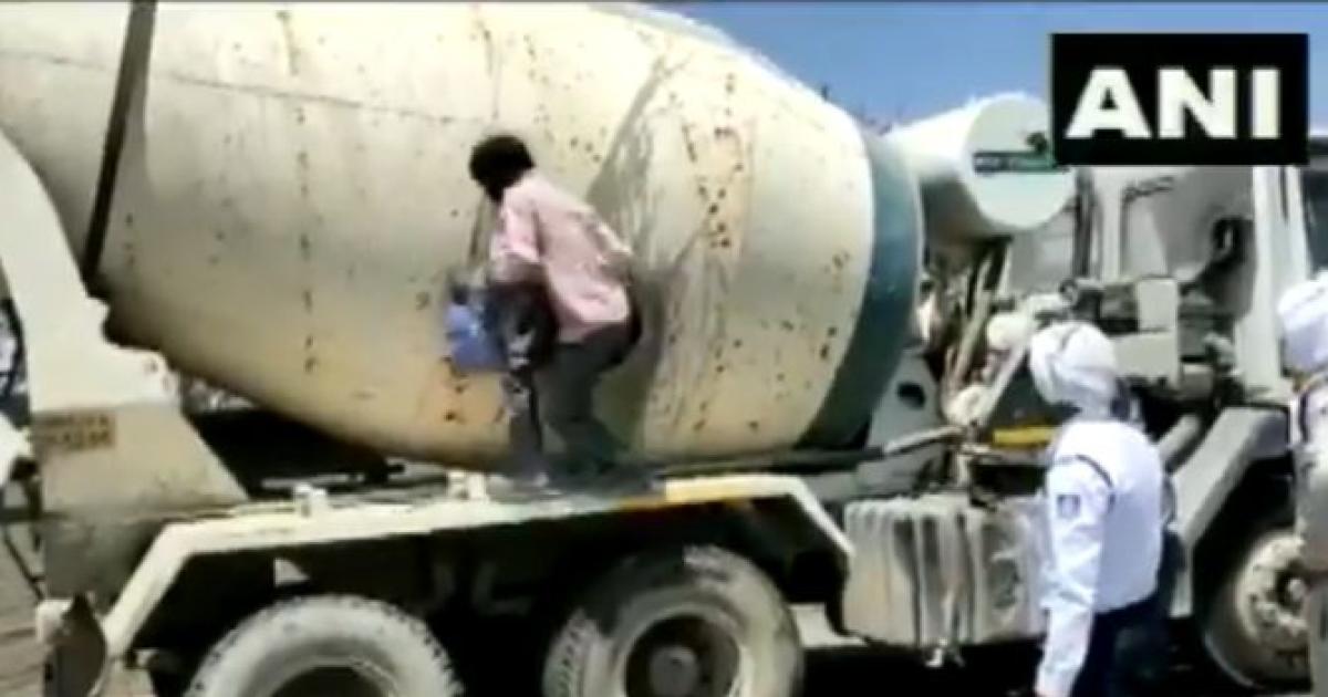 A video of workers emerging from the small hole of the cement-mixer in the presence of police has gone viral on social media.