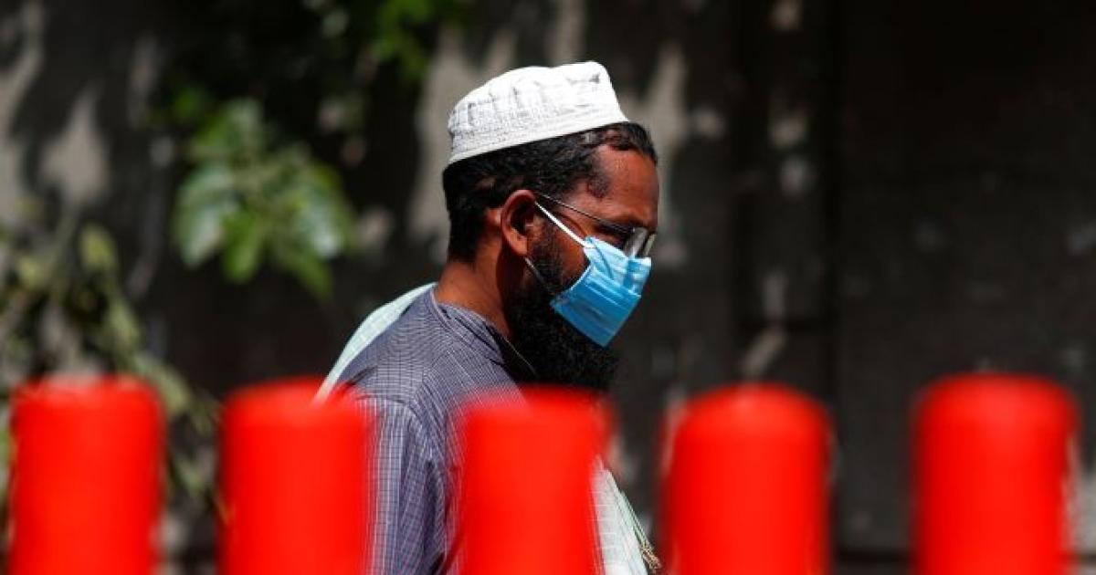 IMAGE: A man wearing a protective mask walks towards a bus that will take him to a quarantine facility, in Nizamuddin, area of New Delhi, last week. Photograph: Adnan Abidi/Reuters