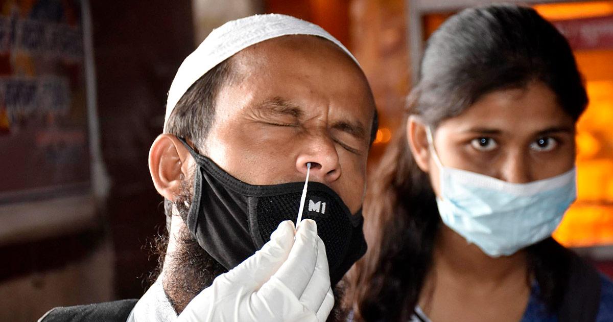 IMAGE: A healthcare worker collects a nasal sample of a passenger, at Patna railway station, after a decrease in the active cases of COVID-19, in Patna. Photograph: ANI Photo