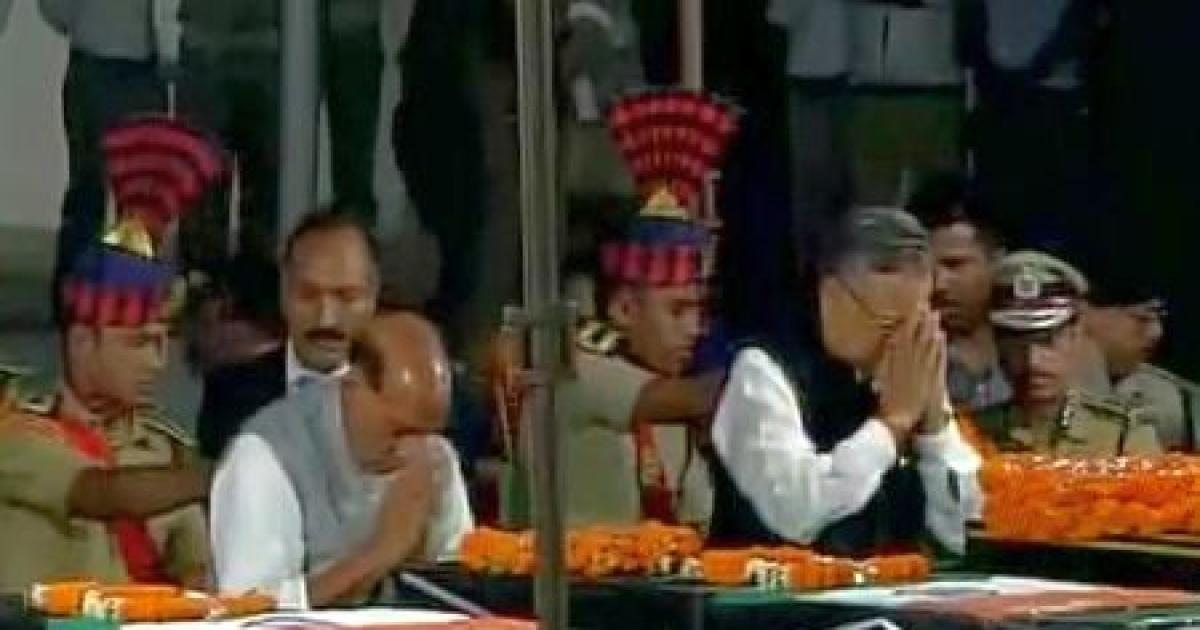 IMAGE: Home Minister Rajnath Singh and Chhattisgarh Chief Minister Raman Singh pay their tributes to martyrs. Photograph: ANI/Twitter